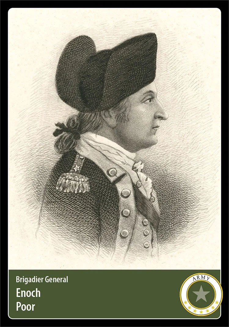 Enoch Poor was present for many of the major battles and events of the Revolutionary War (1775-1783) including Quebec (Canada), Saratoga (New York), Valley Forge (Pennsylvania), and Monmouth (New Jersey). Commissioned as a Brigadier General in 1777, Poor served under Gen. Washington and Gen. Lafayette.