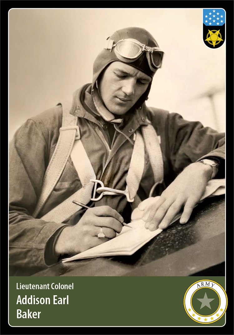 Addison left school early and eventually joined the U.S. Army, enlisting at Fort Hayes in Columbus, Ohio, on January 17, 1929. After serving for a year at Fort Crockett in Galveston, Texas, he went through flight school training at Brooks and Kelly Fields in Texas, and earned his pilot’s wings on February 27, 1931. Three years after enlisting, Baker married his sweetheart, Frances Rodgers.