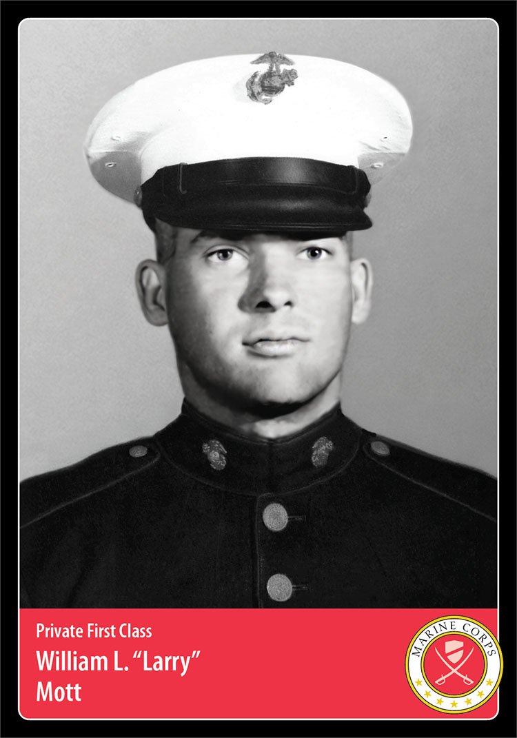 After basic training at MCRD (Marine Corps Recruit Depot) in San Diego, California, PFC Mott was trained as a rifleman and assigned to a sniper platoon, HQ Company, 1st Marine Division, 7th Marines. He was sent overseas and arrived in Vietnam on July 21, 1968.